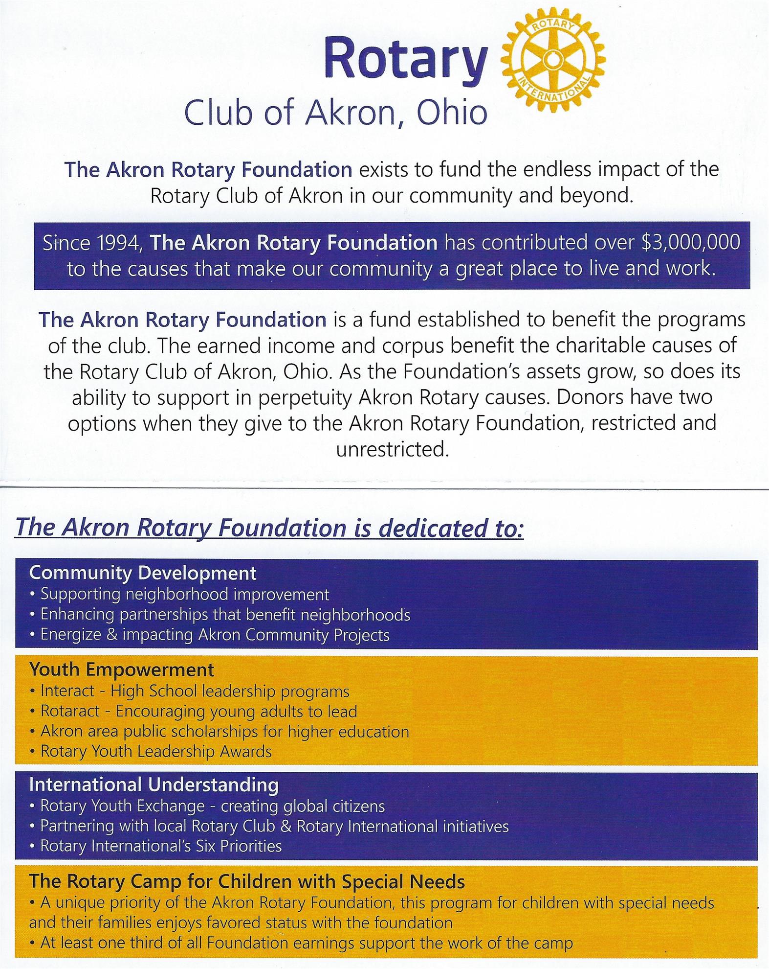 Doug provided a wonderful overview of the Akron Rotary Foundation and provided the following: